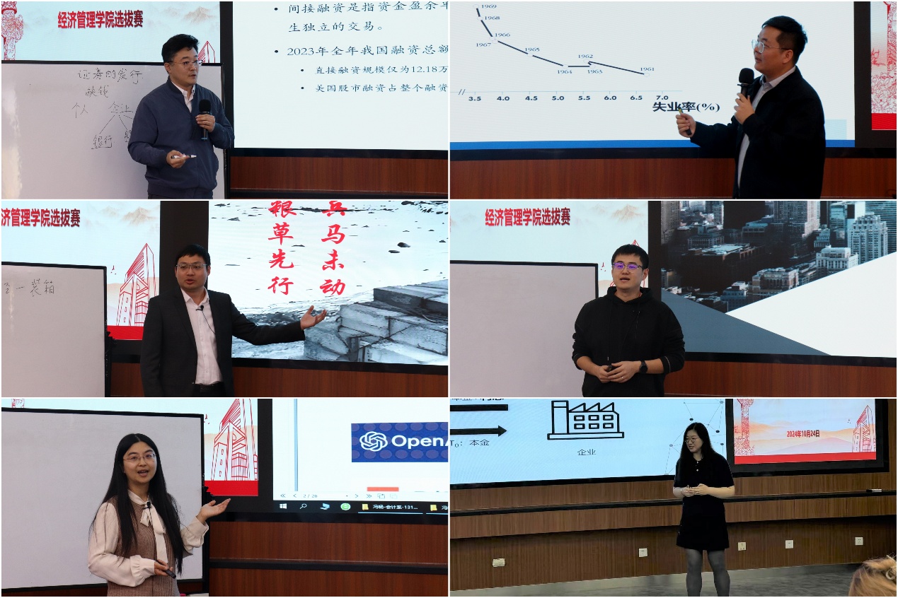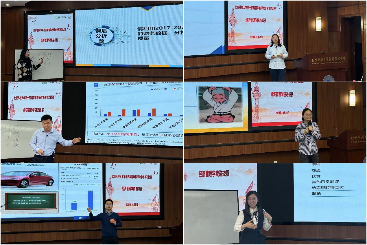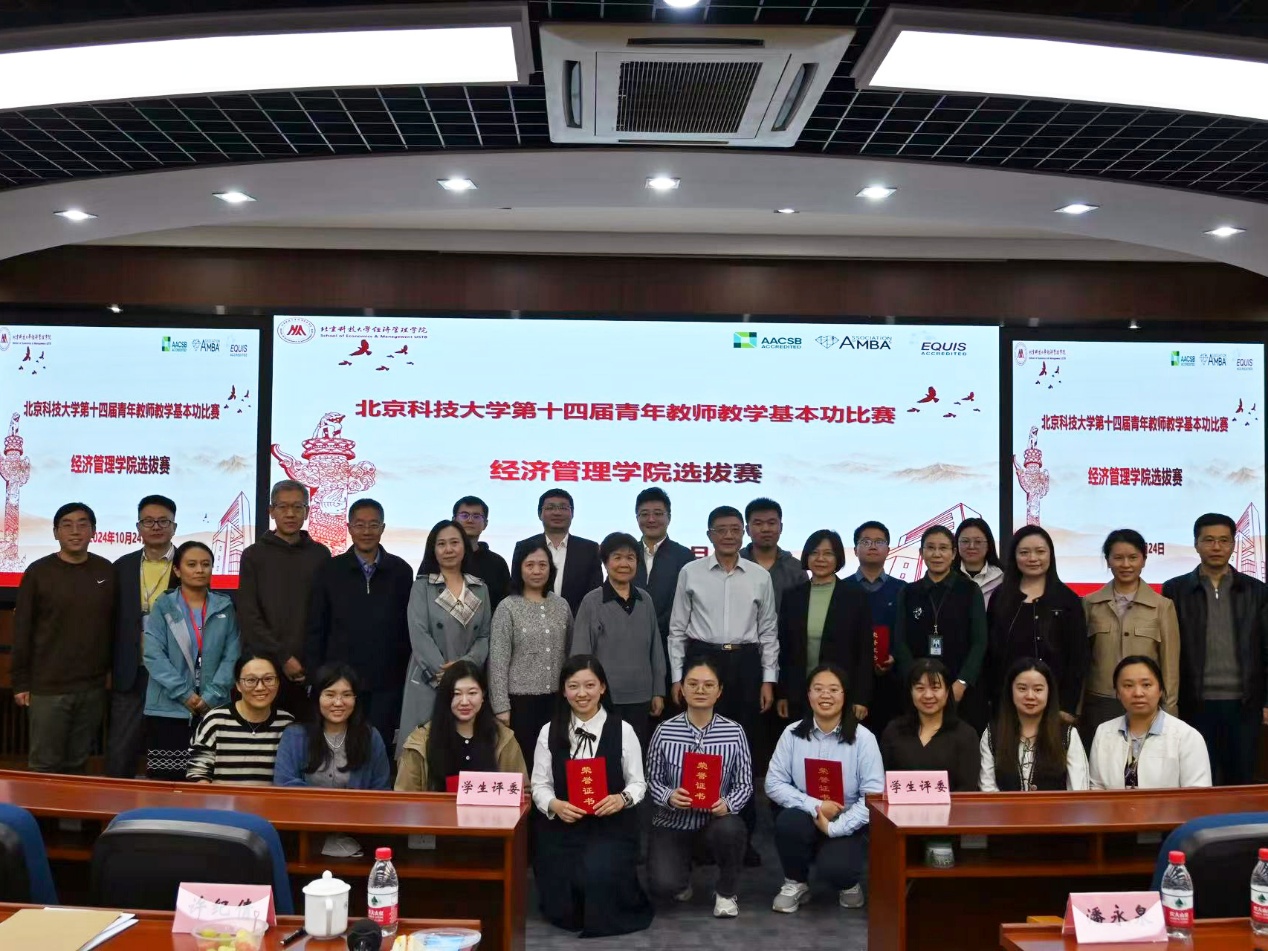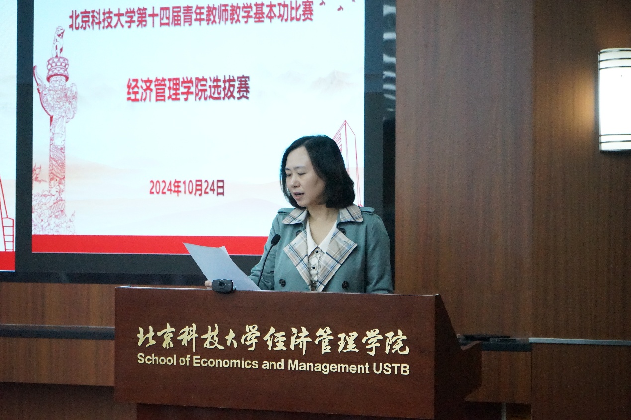 为了提高学院青年教师的教学技能,引导和鼓励青年教师热爱教学、研究教学,锤炼青年教师的教学基本功,经管学院于10月24日下午在经管楼313成功举办第十四届青年教师教学基本功比赛选拔赛,来自不同学科的12名青年教师参加。学院邀请学校教学督导组许纪倩老师、潘永泉老师、戴淑芬老师、学院党委书记武森老师、副院长范小华老师、学院教师发展中心执行主任孙莹老师以及各系教学主任共10位专家评委和来自不同学科专业的12名学生评委。比赛由学院党委副书记、副院长、分工会主席倪宇主持。