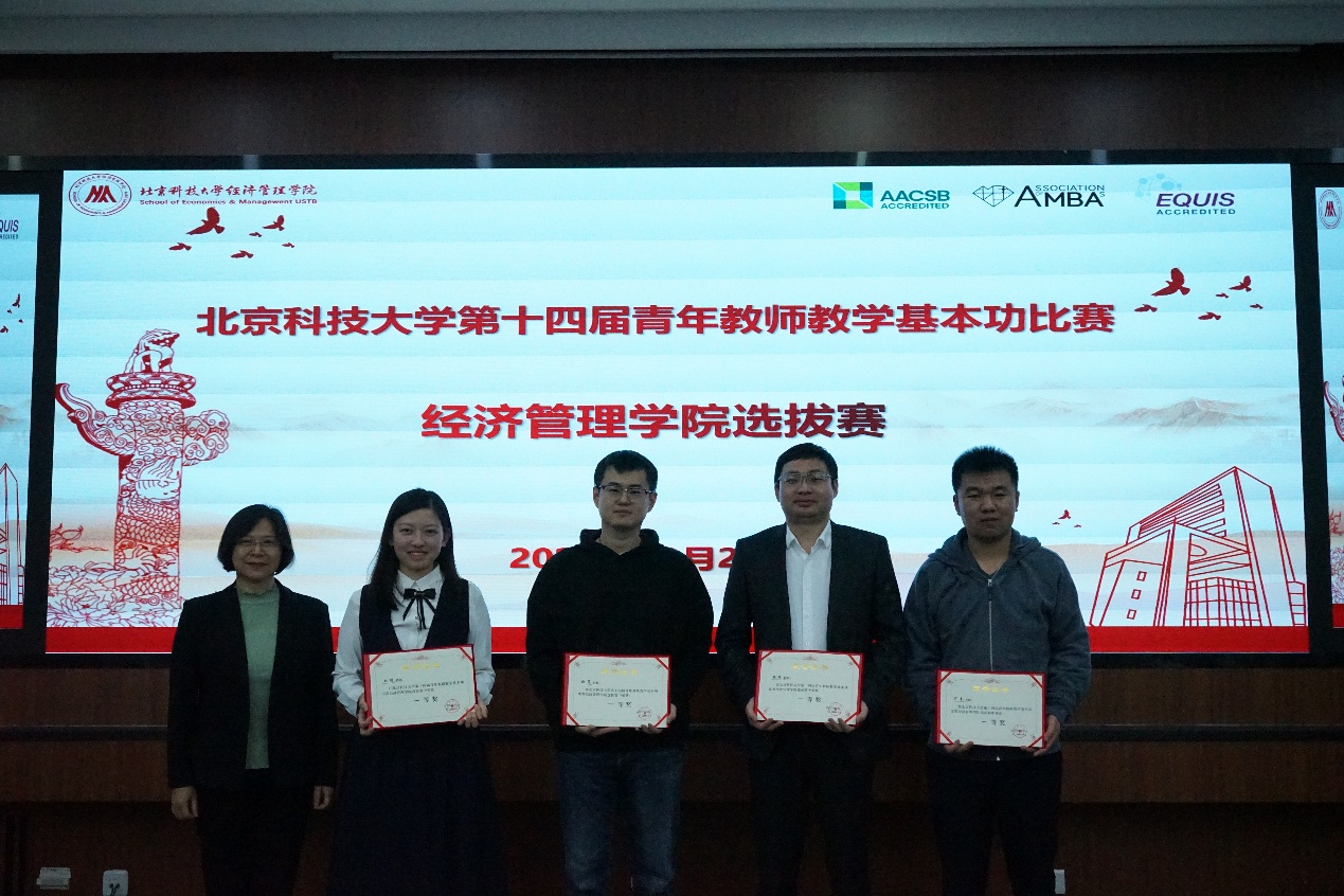 专家评委和学生评委从课程总体设计、教学内容、教学方法、教学仪态、教案及板书和教学效果与特色等方面对参赛教师进行了客观评价,共评选出一等奖4名、二等奖4名、三等奖4名。学院教学副院长范小华老师宣读了比赛成绩,学院党委书记武森为获奖教师颁奖并合影。