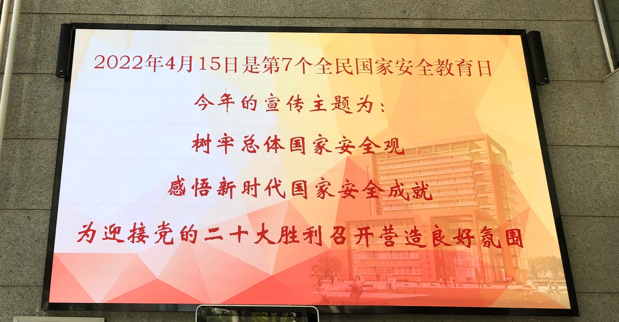 今年的宣传主题为:树牢总体国家安全观,感悟新时代国家安全成就,为迎接党的二十大胜利召开营造良好氛围!学院采取循环播放国家安全宣传教育视频、学院官微发布宣传教育提示、学院教工群内发布宣传提示、张贴保密宣传海报、组织师生参加国家安全知识在线答题活动等多种形式,营造践行总体国家安全观的良好氛围,教育引导广大师生坚持以总体国家安全观为指导,强化国家安全意识,提升维护国家安全的自觉性和主动性,争做捍卫国家安全的宣传员和践行者。