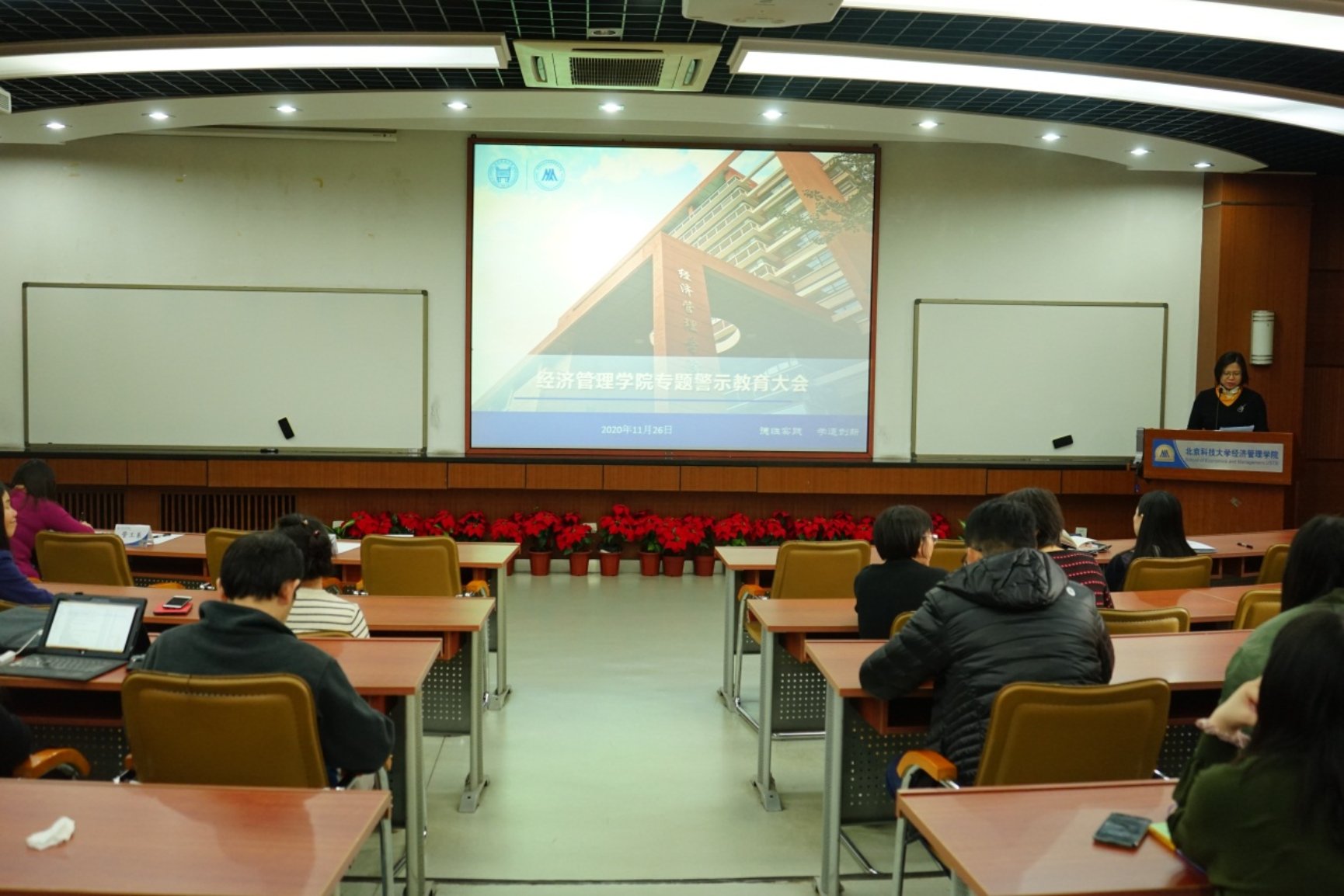 2020年11月26日下午,经济管理学院专题警示教育大会在经管楼313举行。学院全体教职工参加了大会,会议由学院党委书记武森主讲。