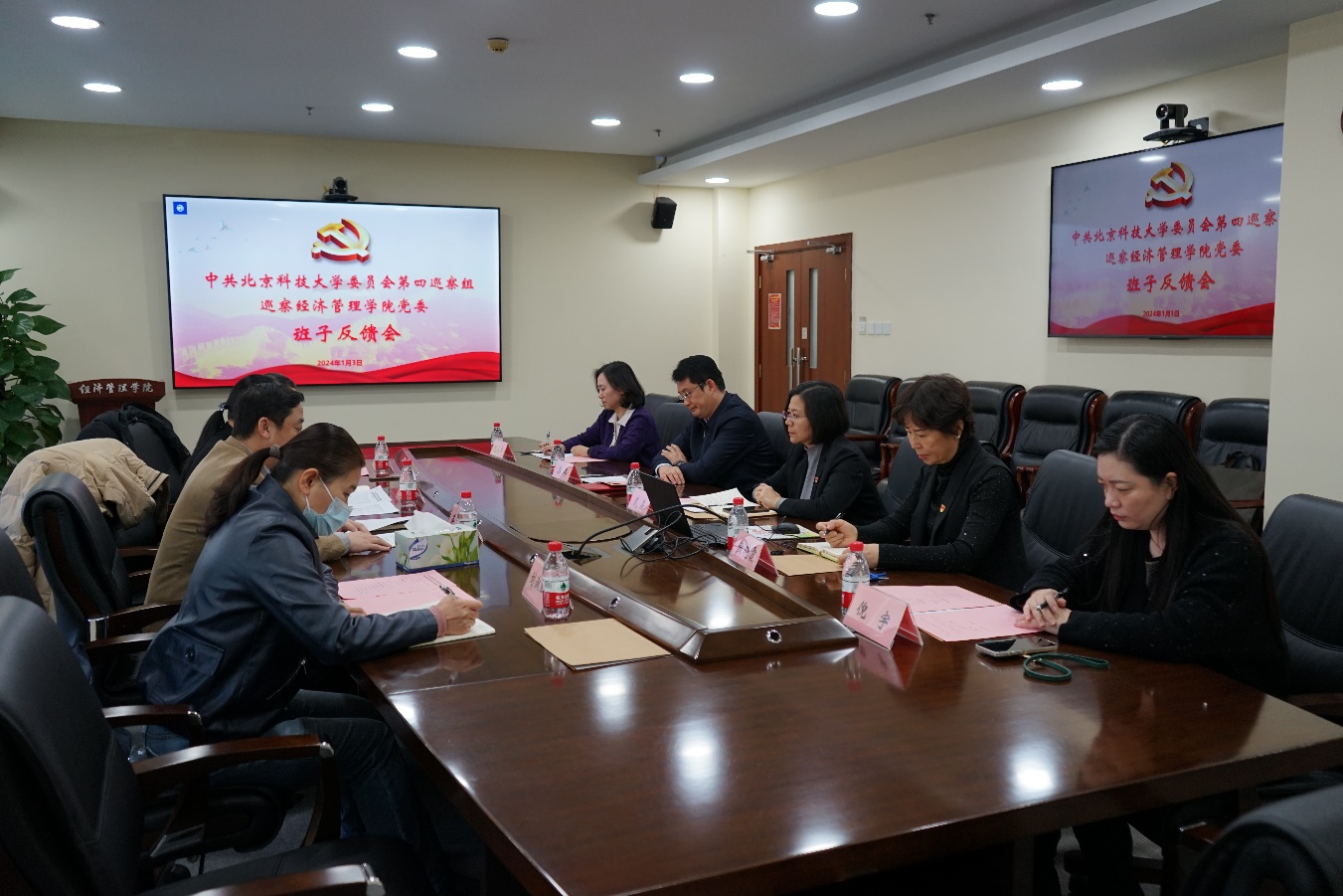 1月2日下午,中共北京科技大学委员会第四巡察组巡察经济管理学院党委情况反馈大会在经管楼313顺利召开。校党委副书记、纪委书记张大林,第四巡察组组长蒋韬,副组长刘淑红、副组长王斌,巡察工作办公室主任张俊燕,巡察组和巡察办的相关同志,经济管理学院党委领导班子成员及师生代表参加了大会。会议由经济管理学院院长谷炜主持。