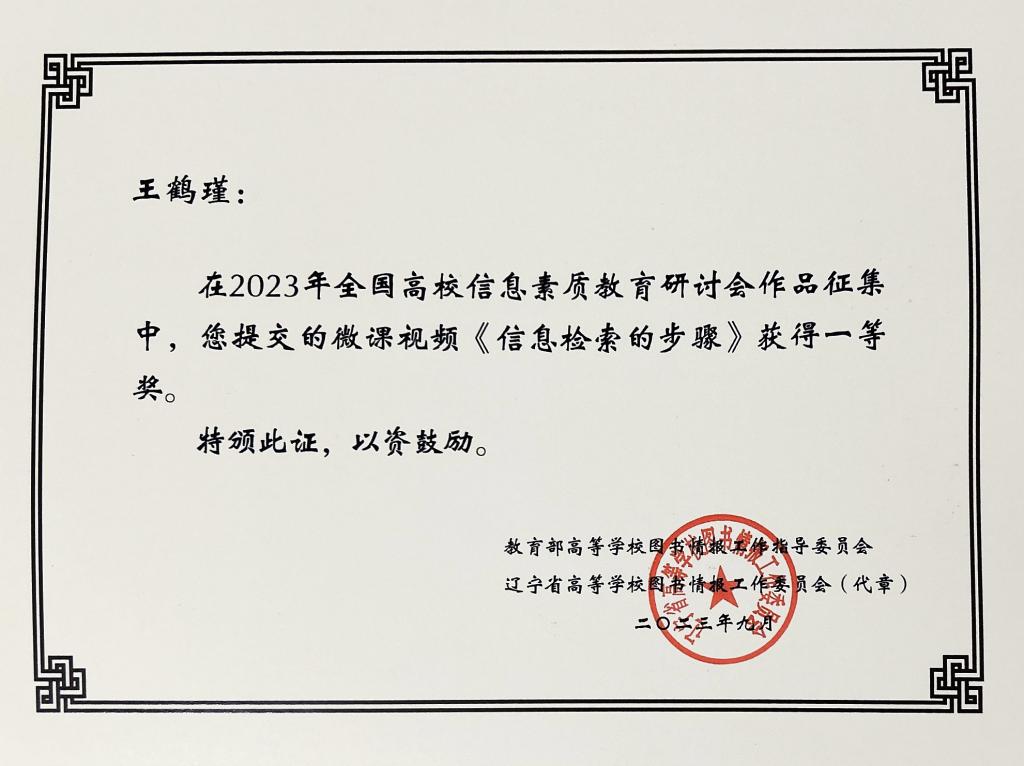 9月21日至23日,2023年全国高校信息素质教育研讨会在沈阳召开,我校图书馆青年教师郭碧玉、王鹤瑾参加研讨会,王鹤瑾老师获微课视频一等奖。