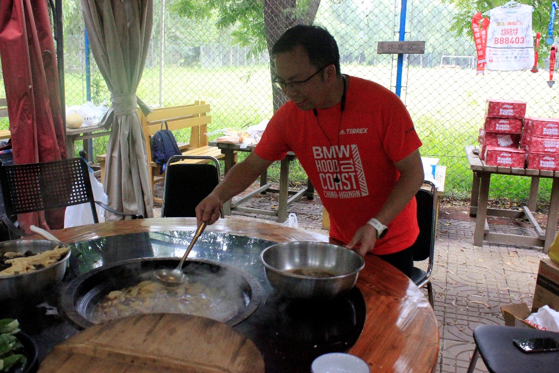 17:20国歌声响起,于淼、郑敏和陶春根3名挑战48小时超马选手准时出发。出发后,以贝壳户外俱乐部秘书长初其衡为首的志愿者团队开始忙前忙后准备补给,考虑到晚上气温低且湿度大,选手跑步后大量出汗,补给还是以粥、面条热食为主,辅以榨菜、豆干、香蕉、葡萄干、各种坚果、士力架等补充能量的食品,补给备有热水、功能饮料和百淬运动营养素等。