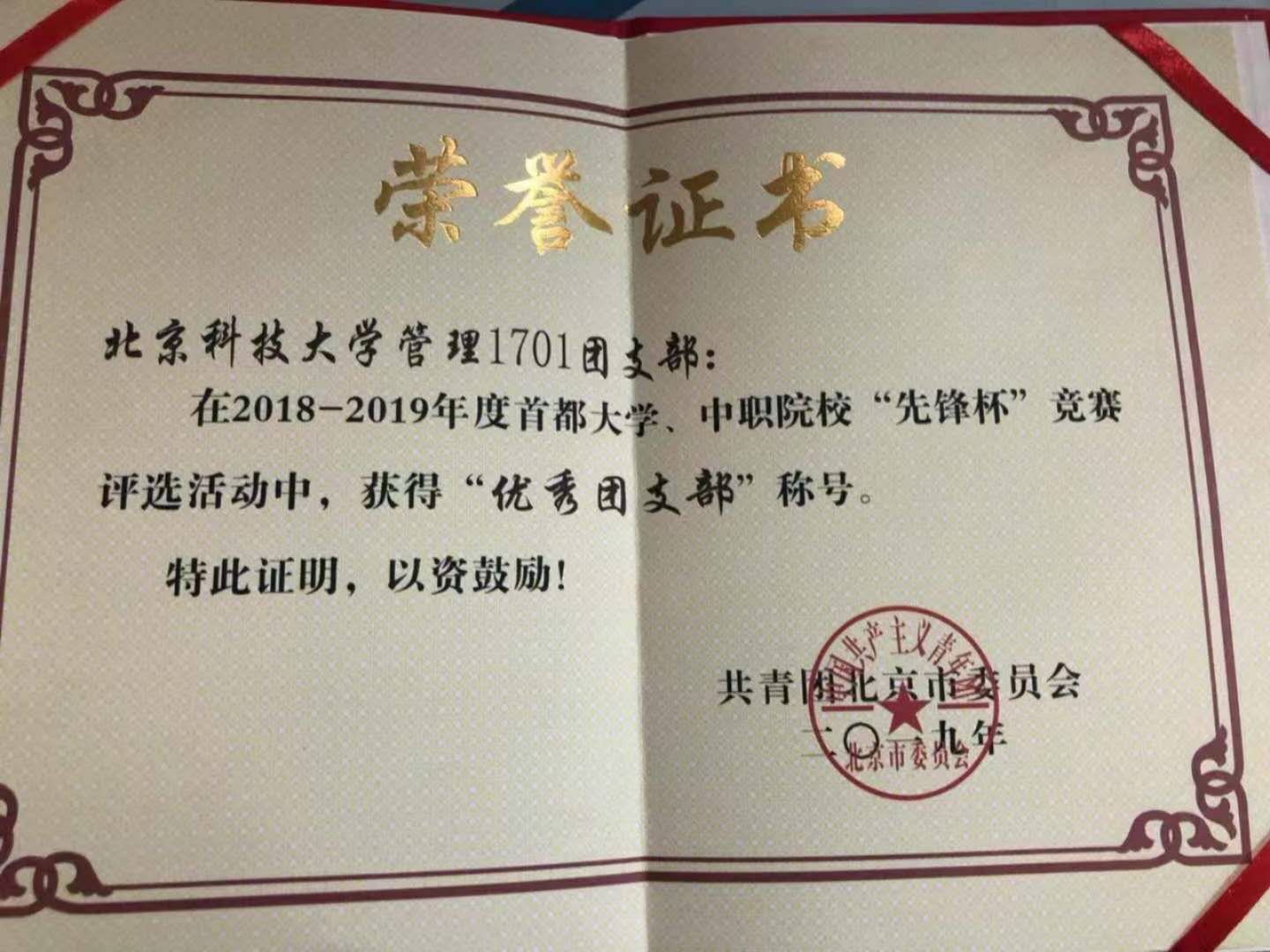 团支部荣获2018-2019年度首都大学、中职院校“先锋杯”优秀团支部、北京科技大学2019-2018和2017-2018年度优秀集体称号以及优秀团支部荣誉称号,支部一直在努力和奋斗,立志从普通走向优秀,从优秀走向卓越。