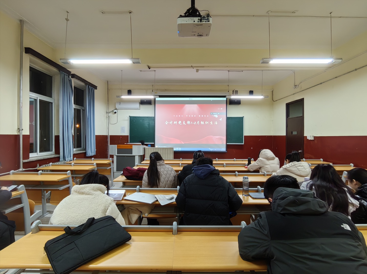2024年3月5日19:00,经济管理学院会计研党支部通过线上和线下结合的方式,分别于腾讯会议和管庄教学楼205顺利开展1-2月组织生活。会议由支部书记张晓涛主持,会计研党支部全体党员及17名积极分子参加。