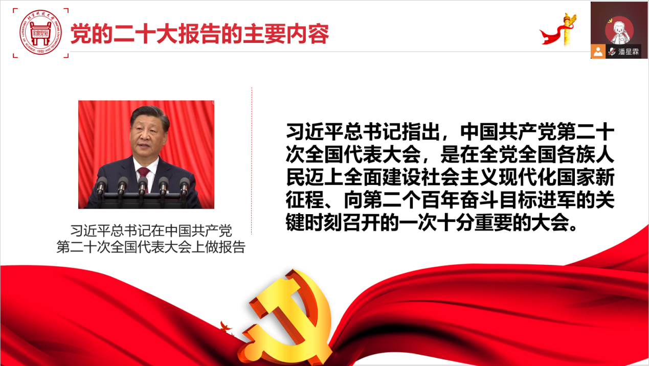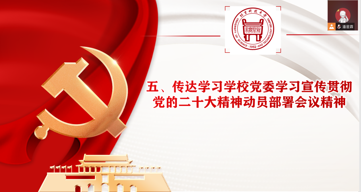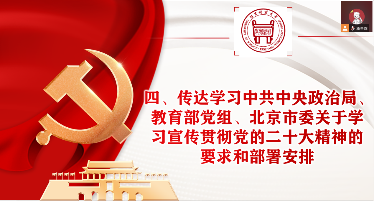 支部书记潘星霖随后向支部成员传达学习中共中央政治局、教育部党组、北京市委关于学习宣传贯彻党的二十大精神的要求和部署安排及学校党委学习宣传贯彻党的二十大精神动员部署会议精神。强调支部成员要始终坚持在思想上政治上行动上同以习近平同志为核心的党中央保持高度一致,全面贯彻落实党的二十大精神,落实习近平总书记重要回信精神,心怀“国之大者”,统一思想、凝心聚力,踔厉奋发、勇毅前行,努力为铸就科技强国、制造强国的钢铁脊梁,助力实现高水平科技自立自强,奋力开创中国特色社会主义新局面,坚定不移推进中华民族伟大复兴历史进程作出新的更大贡献!