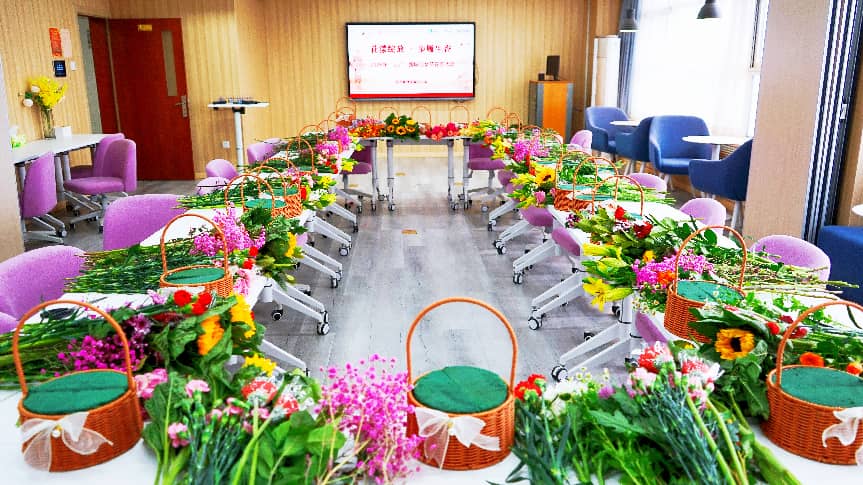花香满室,巧手生春。下午14:00,经管楼1205活动室化作一片花海。康乃馨的温婉、满天星的梦幻、向日葵的明媚……各式鲜花与配材错落有致地铺陈开来,静待一双双巧手的点化。