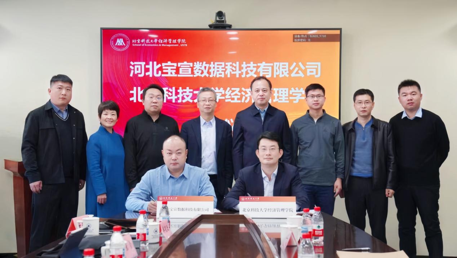 2025年11月13日上午,河钢集团宣钢公司党委书记兼董事长王宏斌、上海宝信软件股份有限公司副总裁张雷、河北宝宣数据科技有限公司总经理蔡震宇一行7人到访经济管理学院,并签订《河北宝宣数据科技有限公司-北京科技大学经济管理学院产学研合作协议》。签约仪式在经管楼809室举行,学院院长谷炜、信息系统与数据科学系主任金家华、管理科学系主任葛泽慧、工商管理系主任尹奎和科研与学科建设办公室主任鲁奇参加了签约仪式。