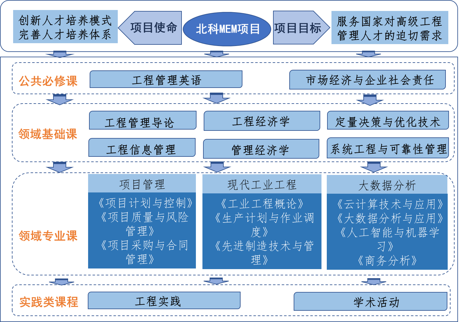 为适应我国现代工程项目对高级管理人才的需求,依托北京科技大学的工科发展背景及经济管理学院的优势学科建设,MEM项目在领域专业课中设置了三个领域的选修课程供学习:项目管理、现代工业工程与精益管理和大数据与商务分析。